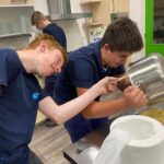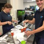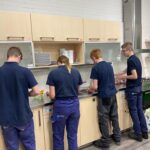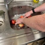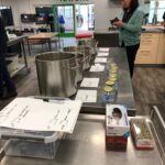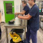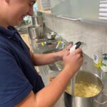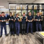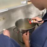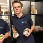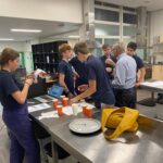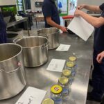 Aan het begin van de les wordt er nog even verteld wat precies de bedoeling is en of iedereen weet wat er vandaag van ze verwacht wordt. Het hele proces wordt nog even doorgenomen. Stap voor stap tot een product komen. Procestechniek is immers het omzetten van grondstoffen naar een eindproduct. Zij zijn de ochtendploeg in de fabriek en aan het eind van de dag moet de appelmoes in de potjes zitten, want dan staat de vrachtwagen voor de deur die de appelmoes naar de klant brengt. Het is geweldig om te zien hoe de leerlingen hun zaakjes op orde hebben. Iedereen heeft zijn of haar spullen bij zich en ze gaan gezamenlijk aan de slag. Het is ook heel vermakelijk om te zien hoe de appels geschild worden. Ze beginnen met een mesje, maar de meesten gaan toch op zoek naar een dunschiller. Ondertussen worden de pannen klaargezet, weegschalen opgezocht, de juiste ingrediënten bij de pannen neergezet en de boel genummerd zodat wel de goede appelmoes in de goede pan wordt gemaakt en wordt het proces bewaakt en hier en daar bijgestuurd. Ondertussen wordt er in de fabriek pauze gehouden en drinken we gezellig koffie met elkaar met een stuk vlaai erbij. De samenwerking gaat goed en de leerlingen helpen elkaar waar nodig. Natuurlijk kan er hier en daar wat verbeterd worden, maar als er in elke fabriek zo’n saamhorigheid zou zijn dan zou de wereld er een stuk leuker uitzien.
